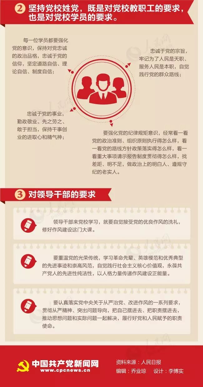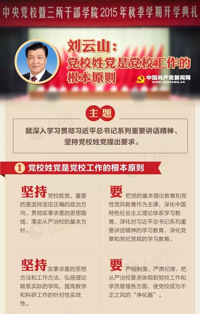 刘云山指出,党校姓党是党校工作的根本原则。坚持党校姓党,重要的是坚持坚定正确的政治方向、贯彻实事求是的思想路线、落实从严治校的基本方针。要把党的基本理论教育和党性党风教育作为主课,深化中国特色社会主义理论体系学习教育,深化对习近平总书记系列重要讲话精神的学习教育,深化党章和党纪党规的学习教育。要坚持实事求是的思想方法和工作方法,弘扬理论联系实际的学风,提高教学和科研工作的针对性实效性。要严明制度、严肃纪律,把从严治校要求体现到党校工作和学员管理各方面,使党校成为不正之风的“净化器”。